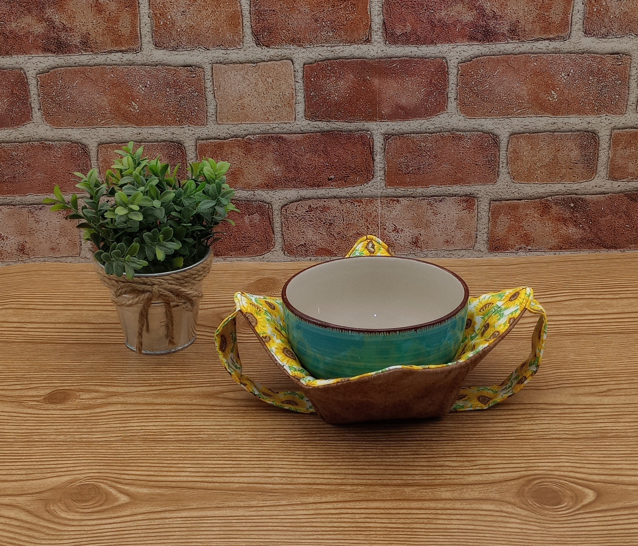 Handmade bowl cozies with a versatile strap for hand support, adding ease and comfort to meal time.